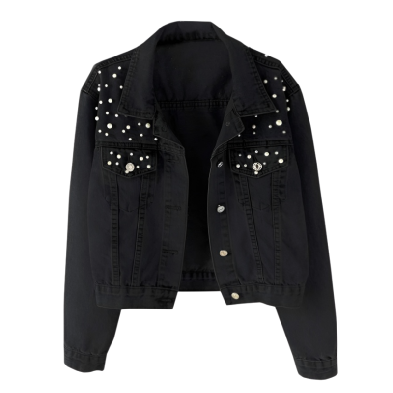 جاكيت جينز نسائي مزين بالخرز وأحجار الراين واللؤلؤ، بقصة فضفاضة